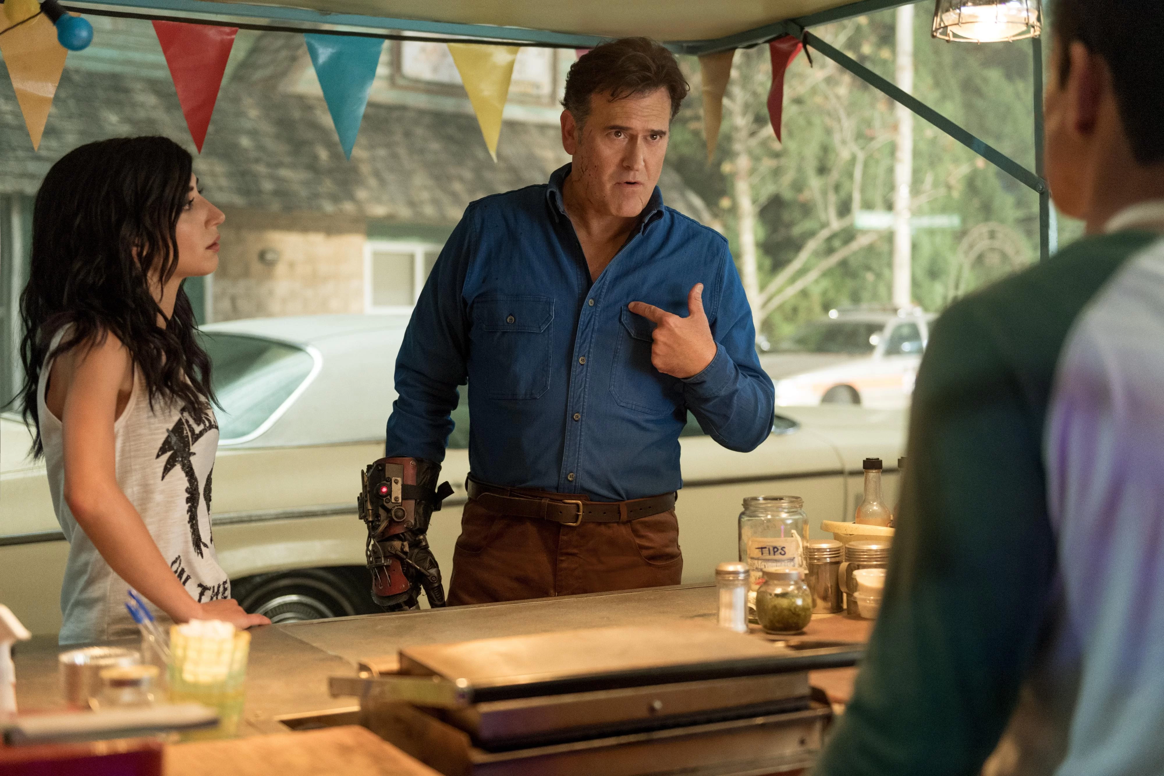 - В ролях актеры: Брюс Кэмпбелл, Рэй Сантьяго, Дэна ДеЛоренцо, Люси Лоулесс, Джилл Мари Джонс, Ариэль О’Нилл, Ли Мэйджорс, Тед Рэйми
